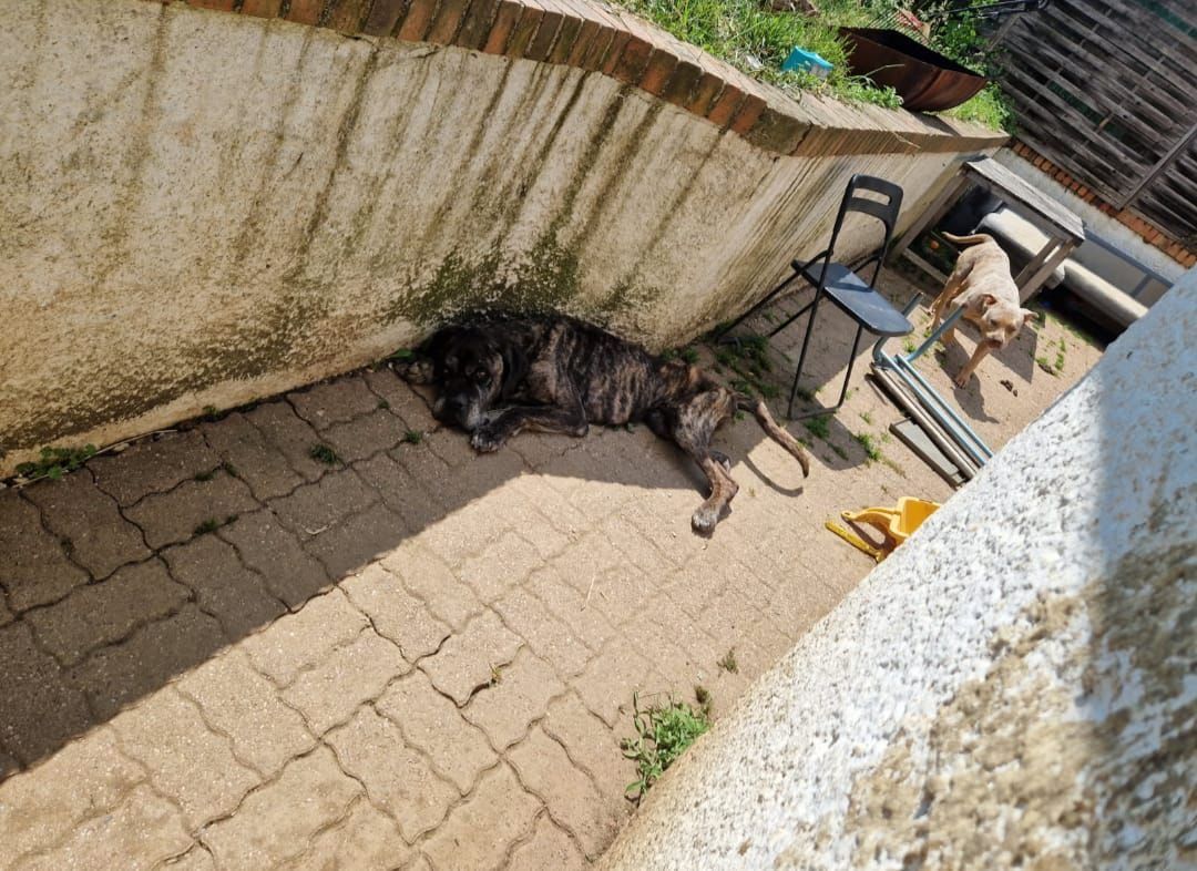 Orson, un Cané Corso de 7 ans, vivait enfermé dans un garage, isolé, privé de soins et quasiment sans nourriture. Sa propriétaire, lassée de lui, n’attendait plus que sa mort. À ses côtés, Murcela, une jeune chienne utilisée comme reproductrice, subissait elle aussi la maltraitance : amaigrie, enfermée sur une terrasse brûlante, elle n’était nourrie que pour pouvoir continuer à rapporter de l’argent grâce à ses portées. Lors de l’intervention, les deux chiens étaient bloqués sous un soleil de plomb, sans eau ni abri, dans un état de faiblesse extrême.