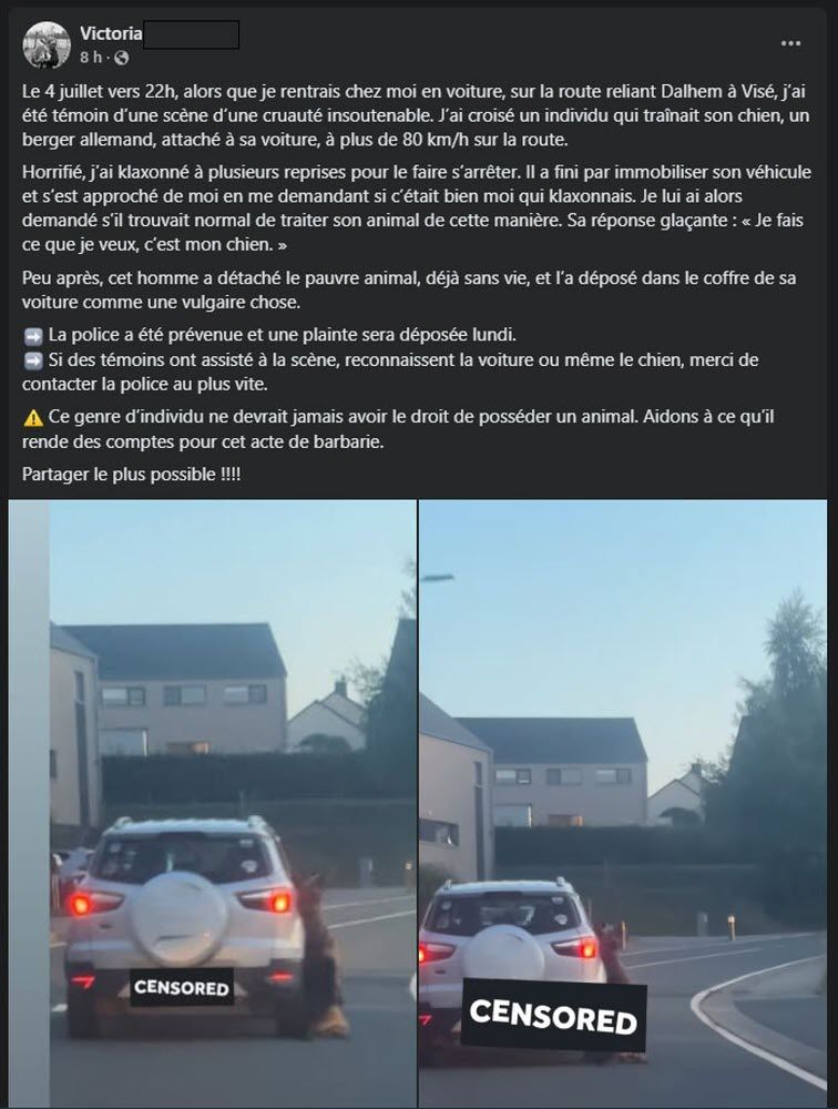 Les faits se sont déroulés vendredi soir. Une conductrice, témoin de l’horreur, a tenté d’alerter le propriétaire du chien, qui n’a stoppé son véhicule que tardivement. Malheureusement, Arès, un berger allemand, n’a pas survécu à ses blessures. Grâce à la vidéo partagée en ligne, l’identité du propriétaire a été retrouvée rapidement. Ce dernier affirme qu’il s’agissait d’un accident, expliquant ne pas avoir remarqué la présence de l’animal à l’extérieur du véhicule. Une enquête pour maltraitance animale a été ouverte, et la commune de Dalhem ainsi que l’association Gaïa se sont portées parties civiles.