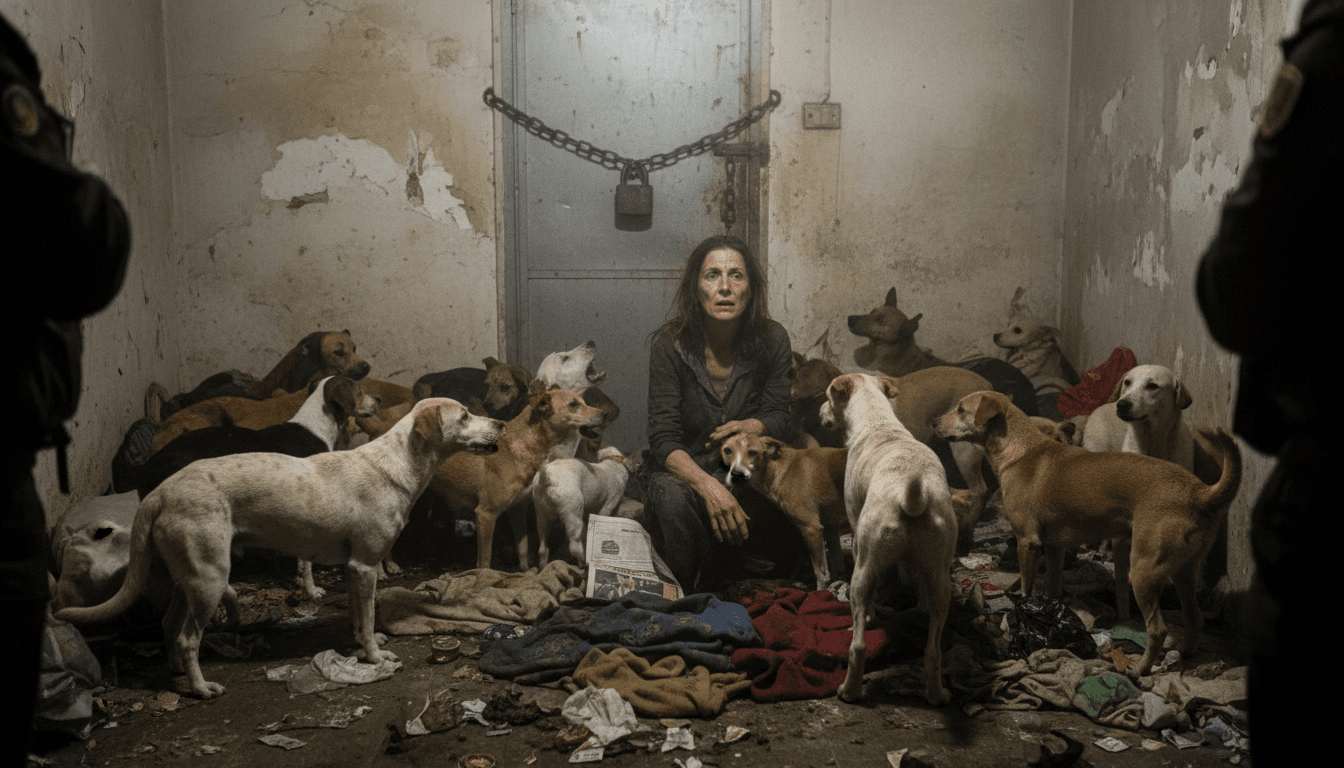 Tout a commencé lorsqu’un policier, venu pour une simple visite administrative, a ouvert la porte d’une annexe à moitié en ruine. À l’intérieur, une odeur insoutenable et une vision cauchemardesque : le sol jonché d’excréments, des chiens errant partout, et une femme épuisée, vivant sans eau ni électricité. Elle expliquera plus tard qu’elle n’avait pas quitté cette pièce depuis quatre ans, de peur de son mari, un homme connu pour son comportement étrange, retrouvé mort d’une crise cardiaque quelques jours auparavant.